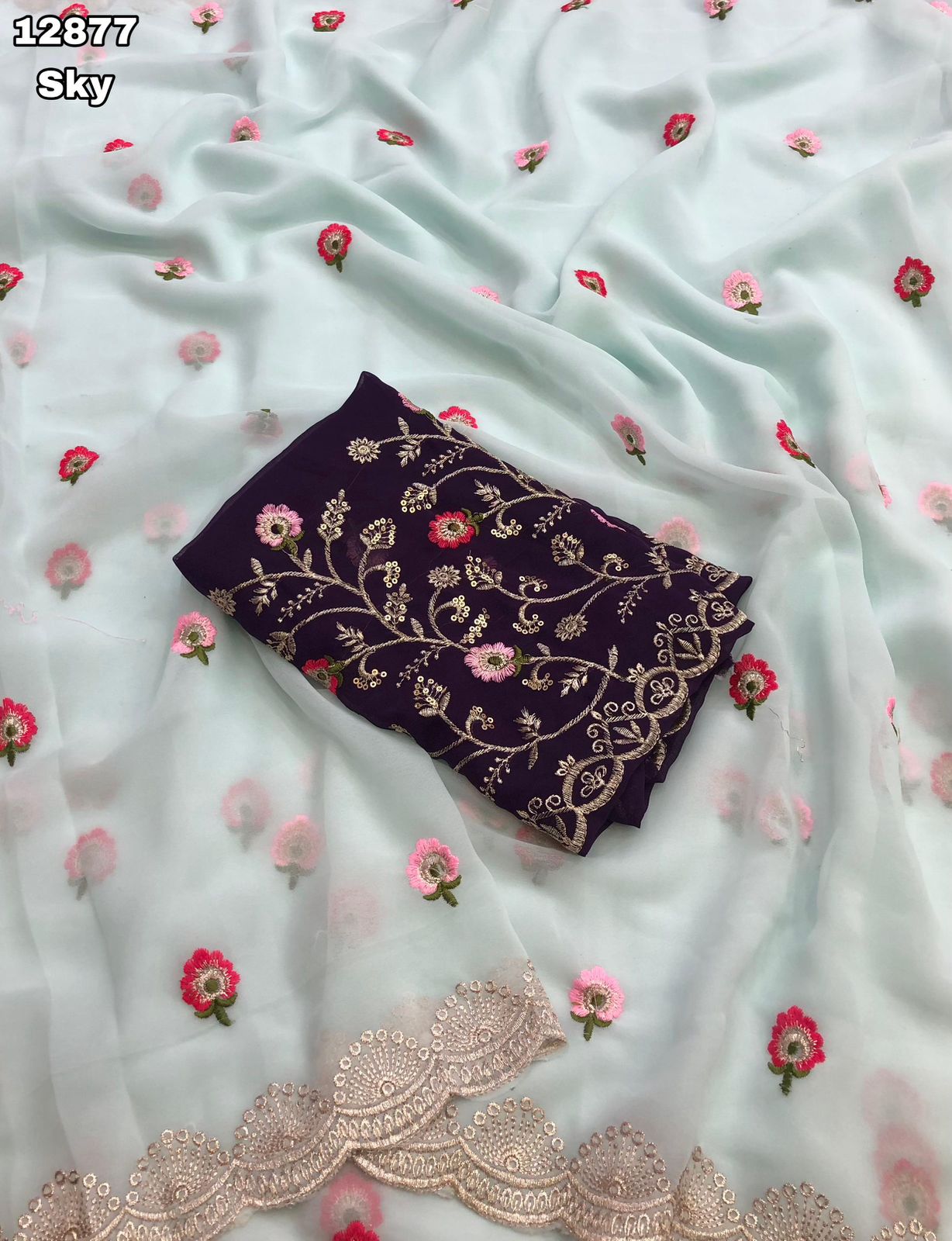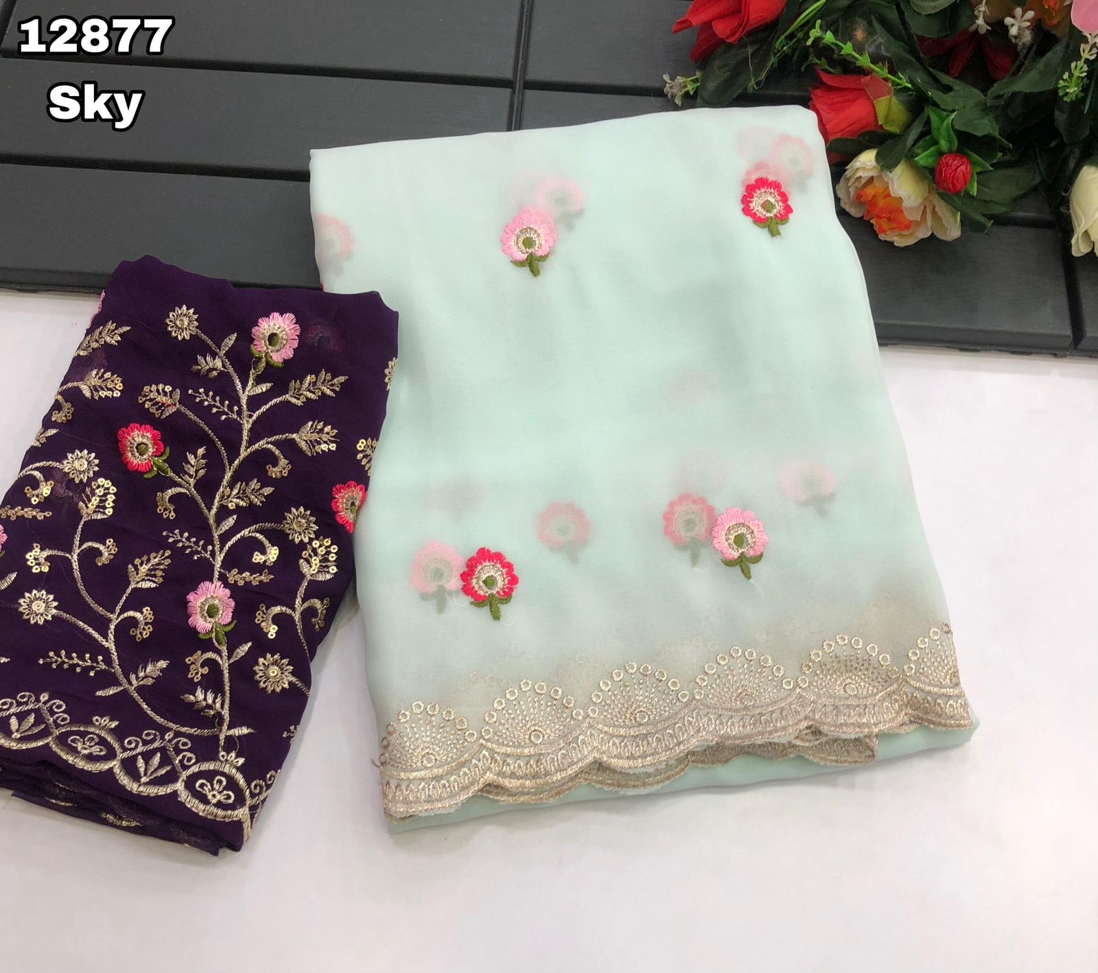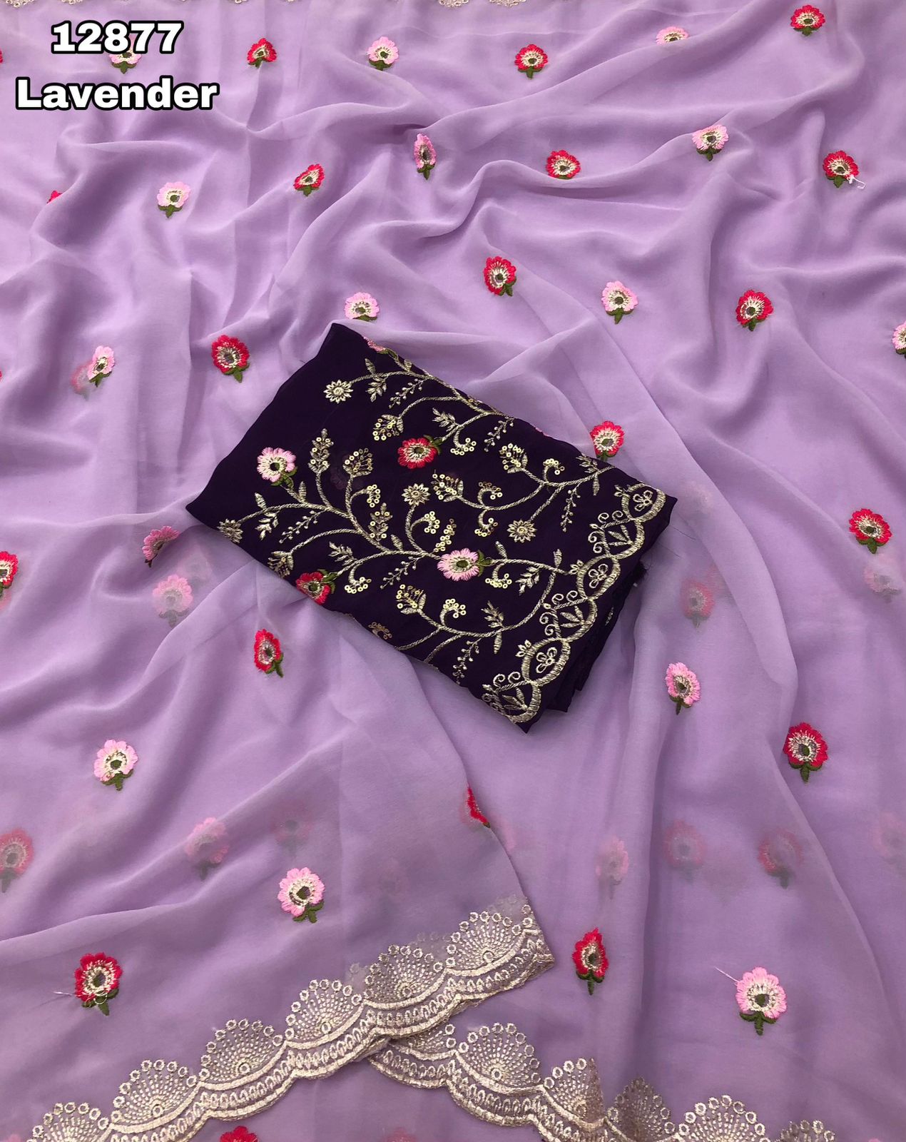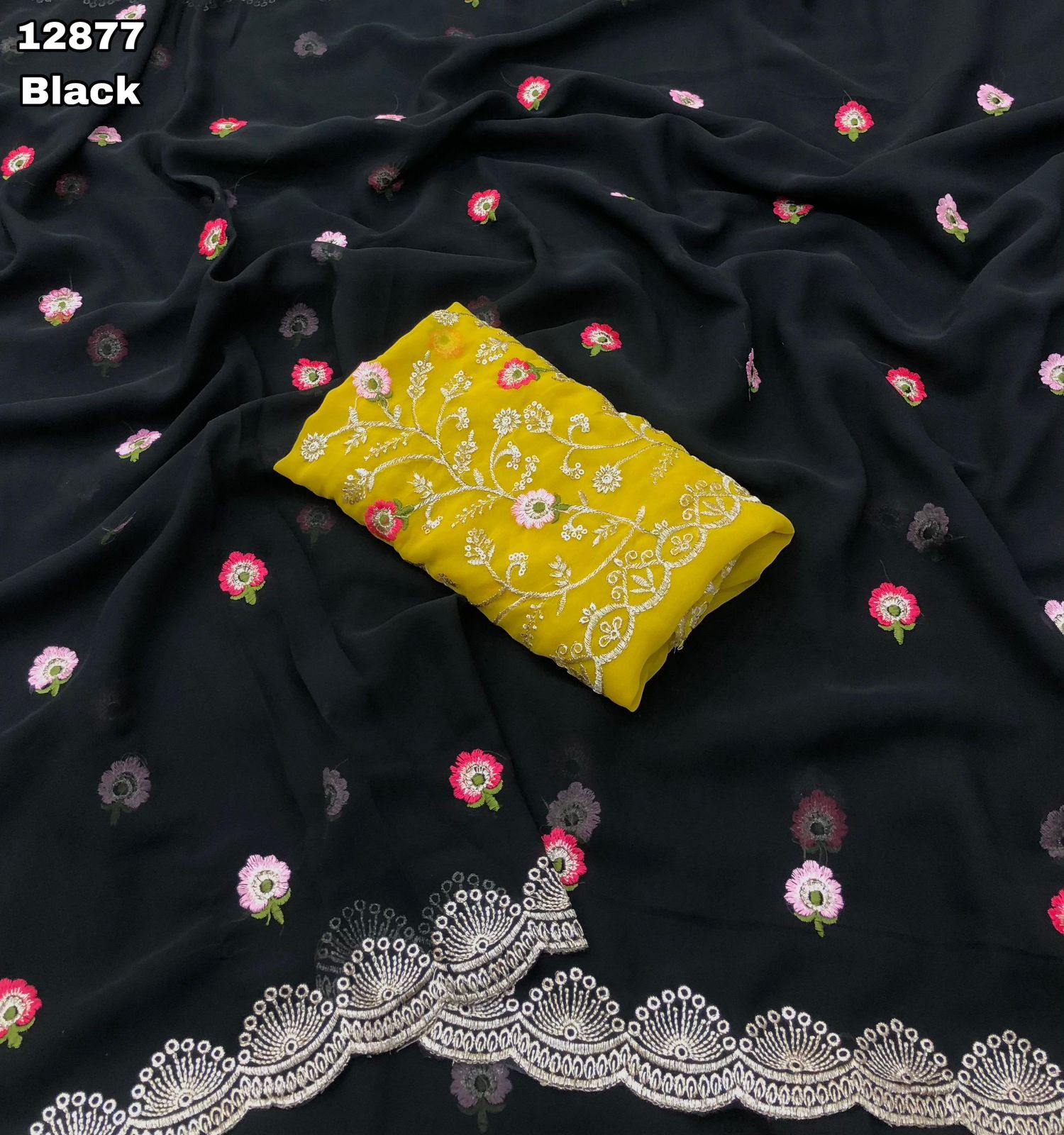 Fabric – georgette with multi floral embroidery design work with embroidery work scalloped cutwork border