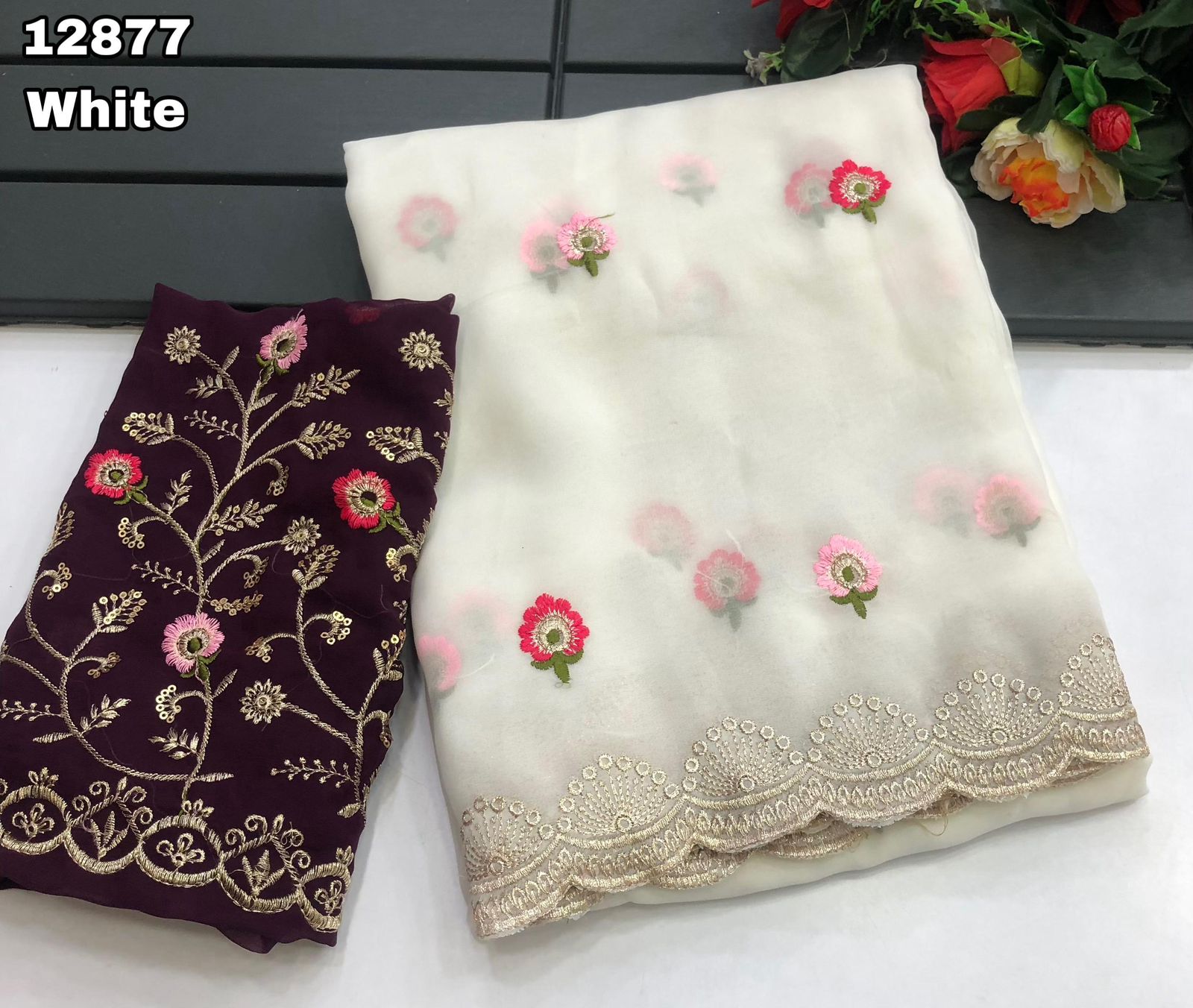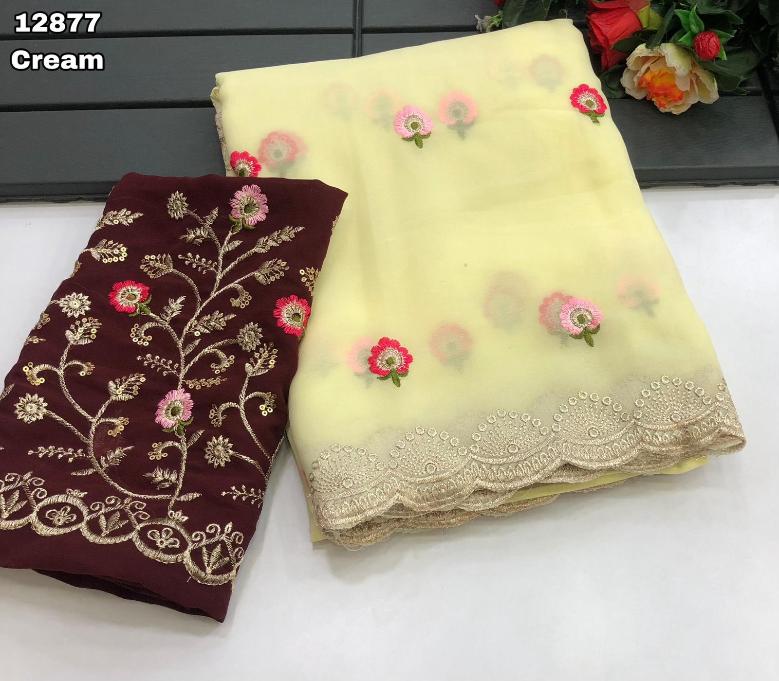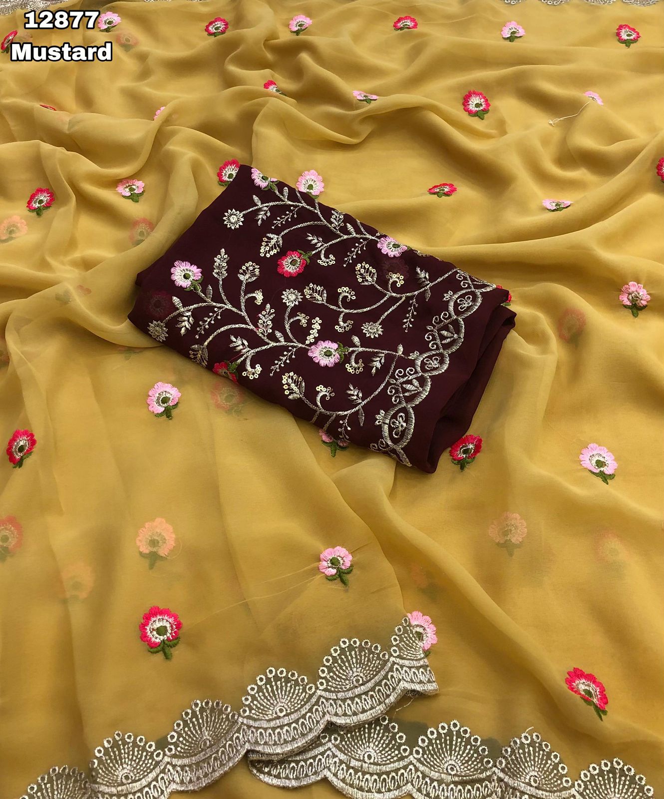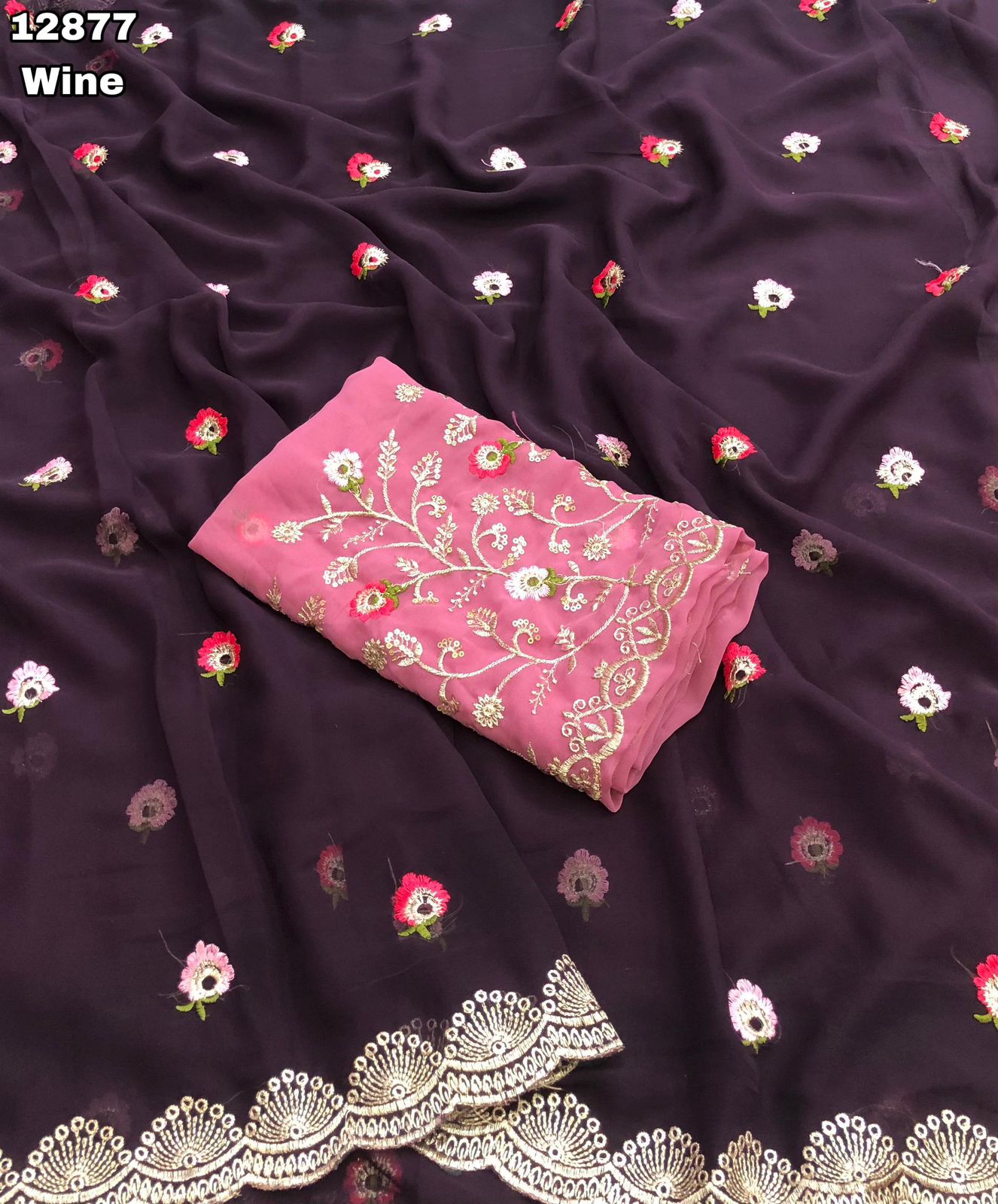 Fabric – georgette with multi floral embroidery design work with embroidery work scalloped cutwork border