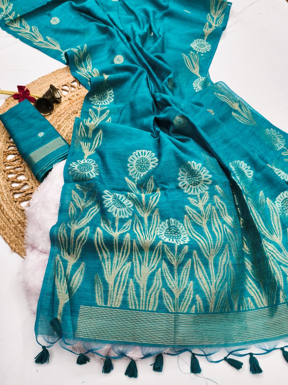 Fabric:Premium soft jute linen silk Saree will rich zari weaved pallu and multicolour zari weaves border and all over weaves buttis with fancy