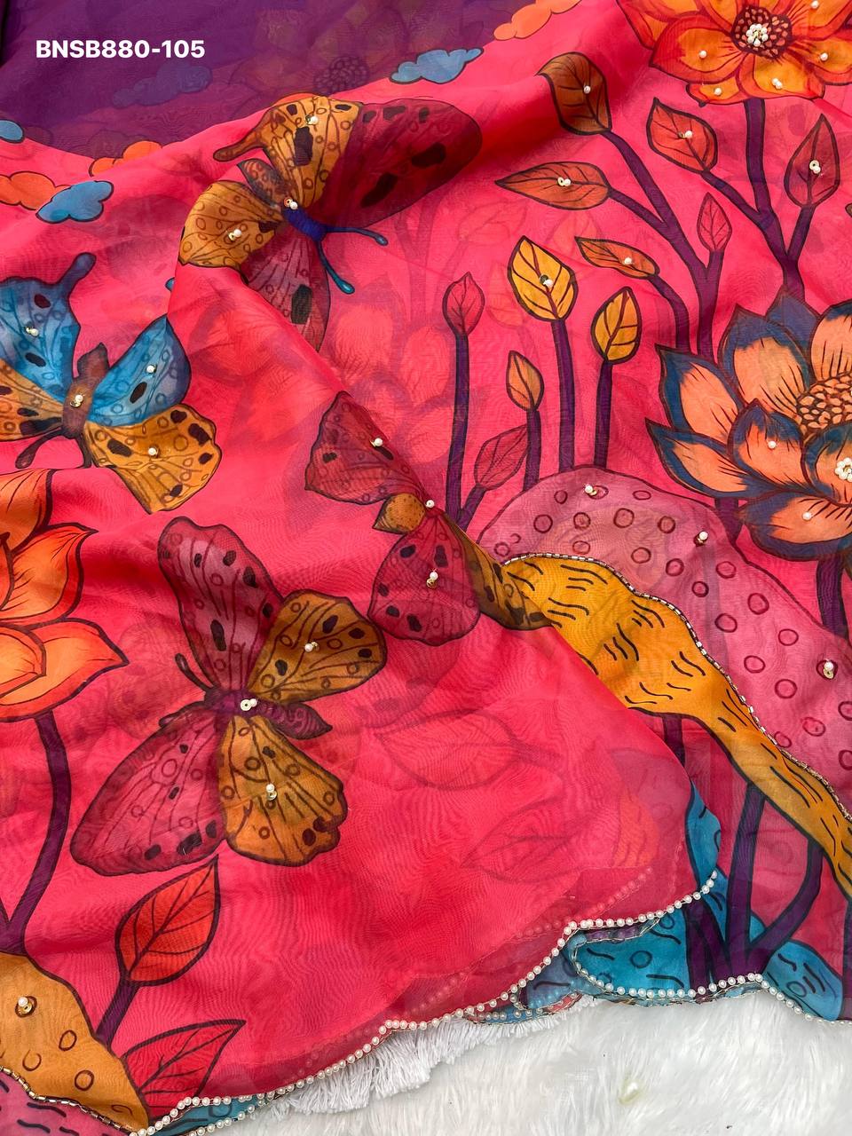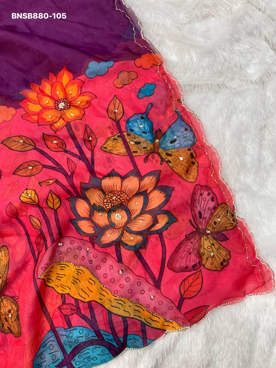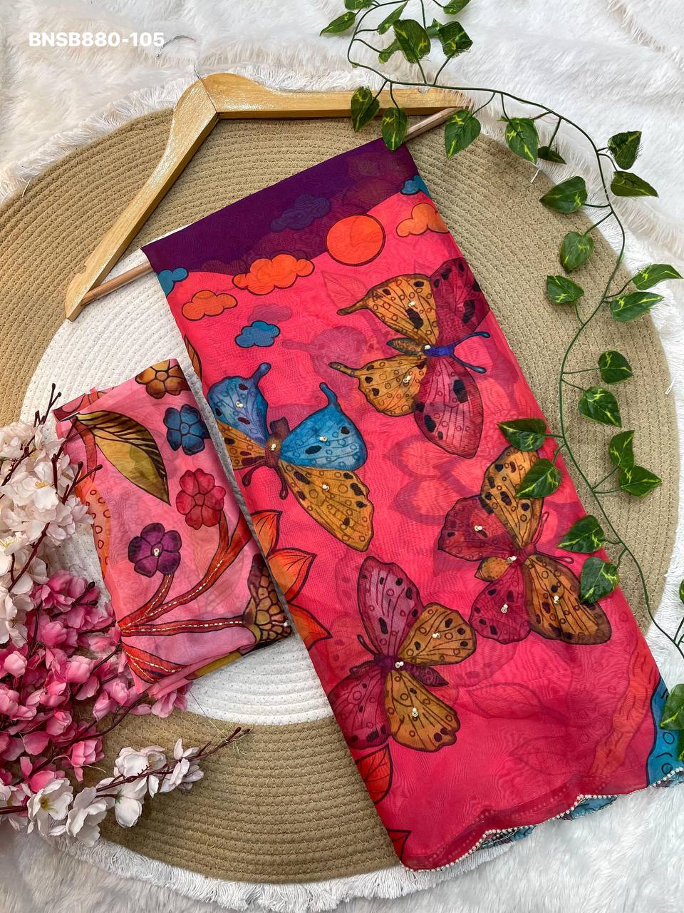 Very Soft nd Elegant Teby silk fabric with beautiful butterfly digital print with cutdana moti nd sequence khatli work in saree nd cutdana border aarco..