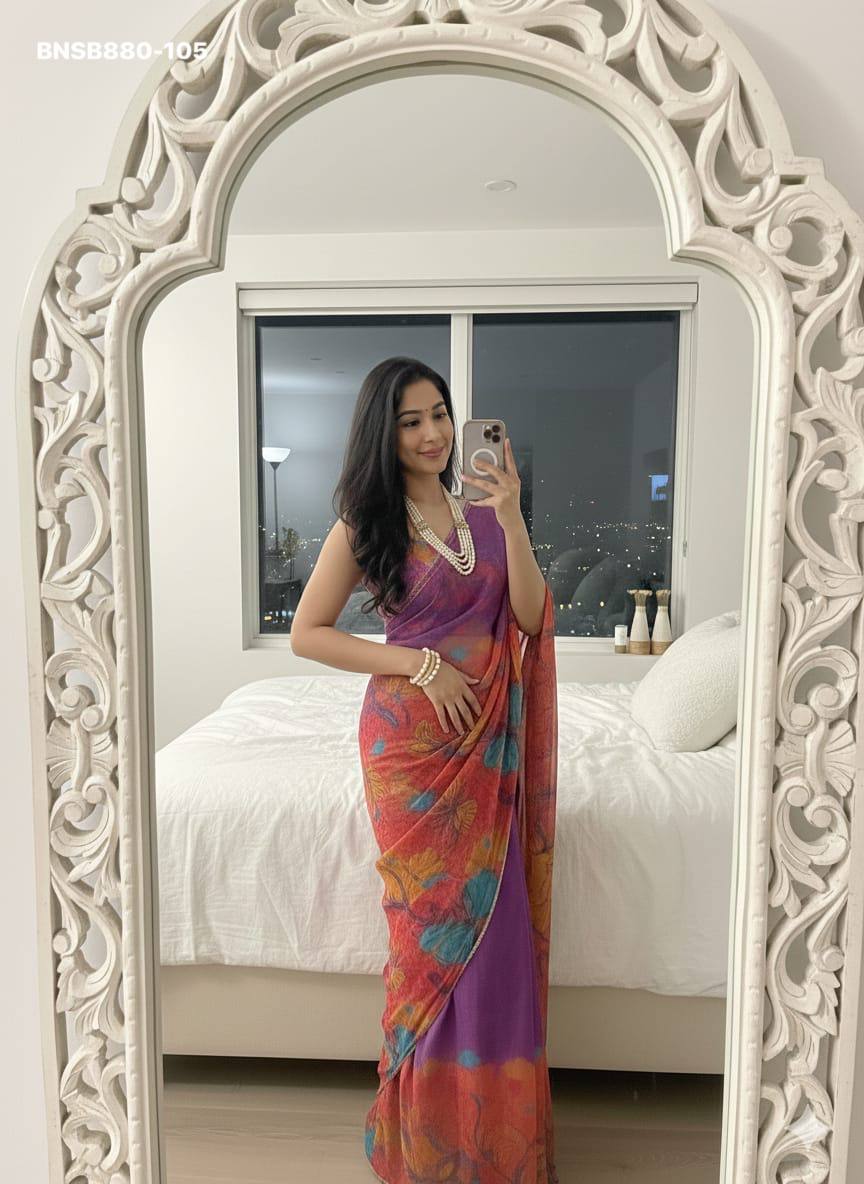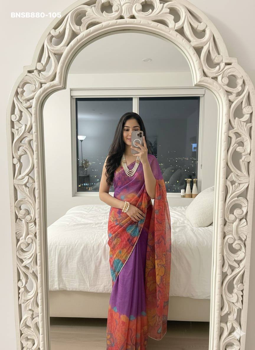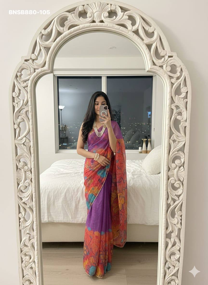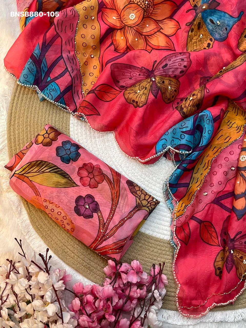 Very Soft nd Elegant Teby silk fabric with beautiful butterfly digital print with cutdana moti nd sequence khatli work in saree nd cutdana border aarco..