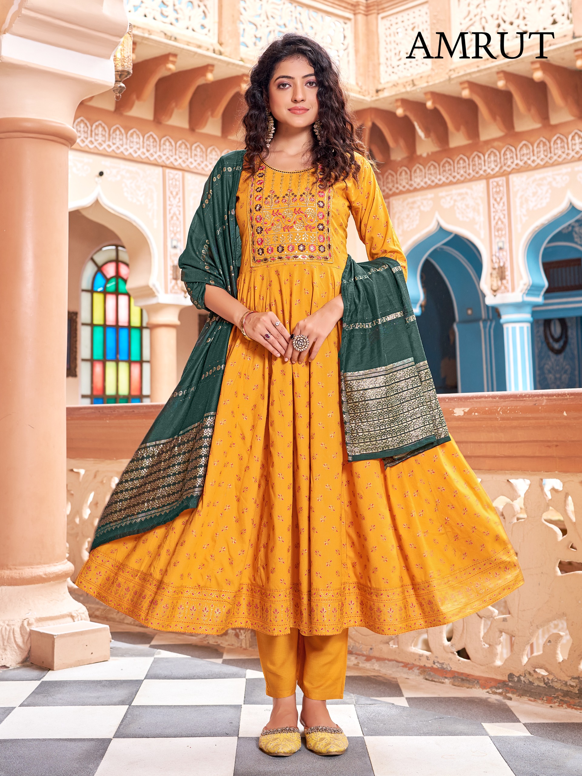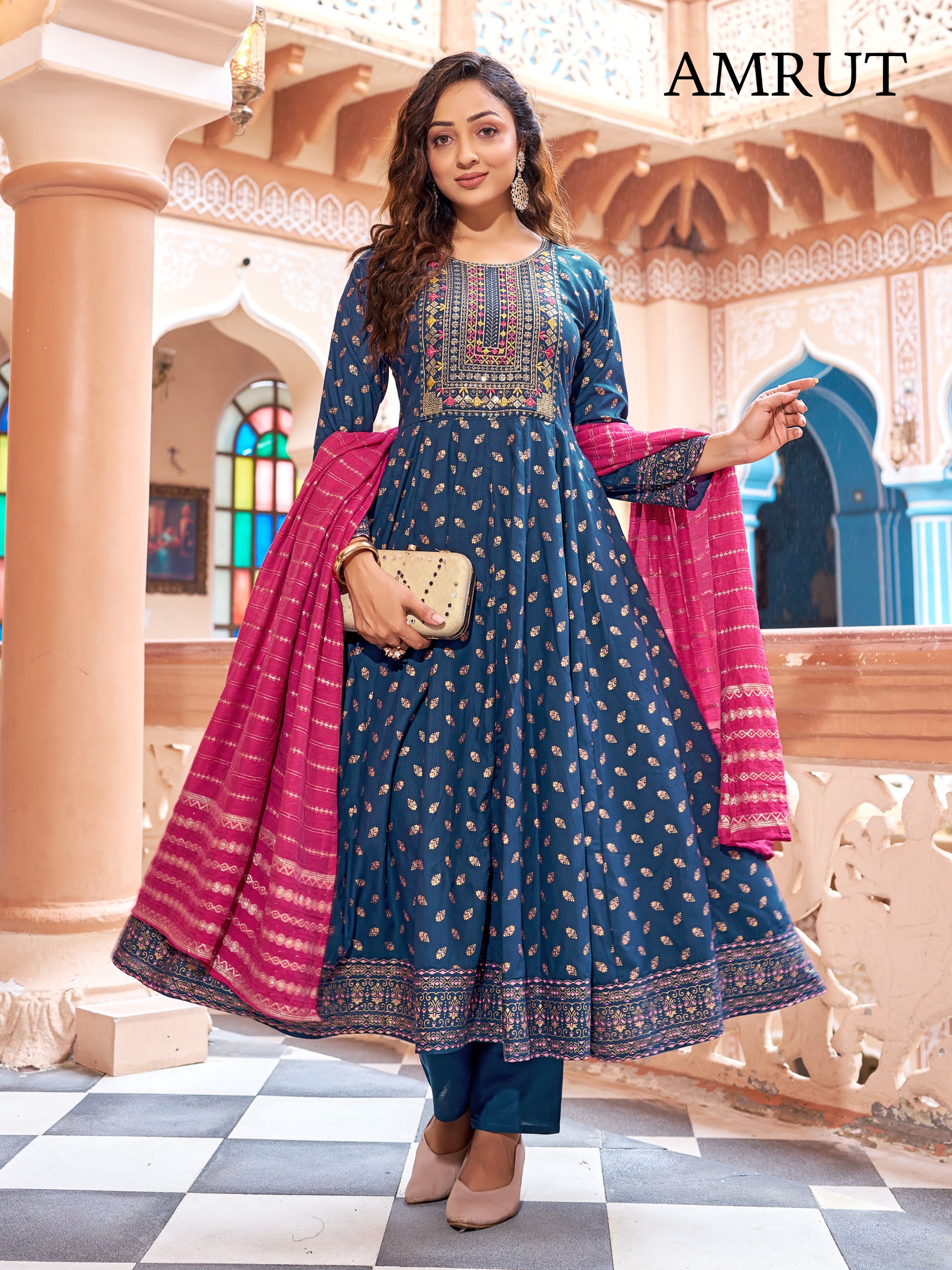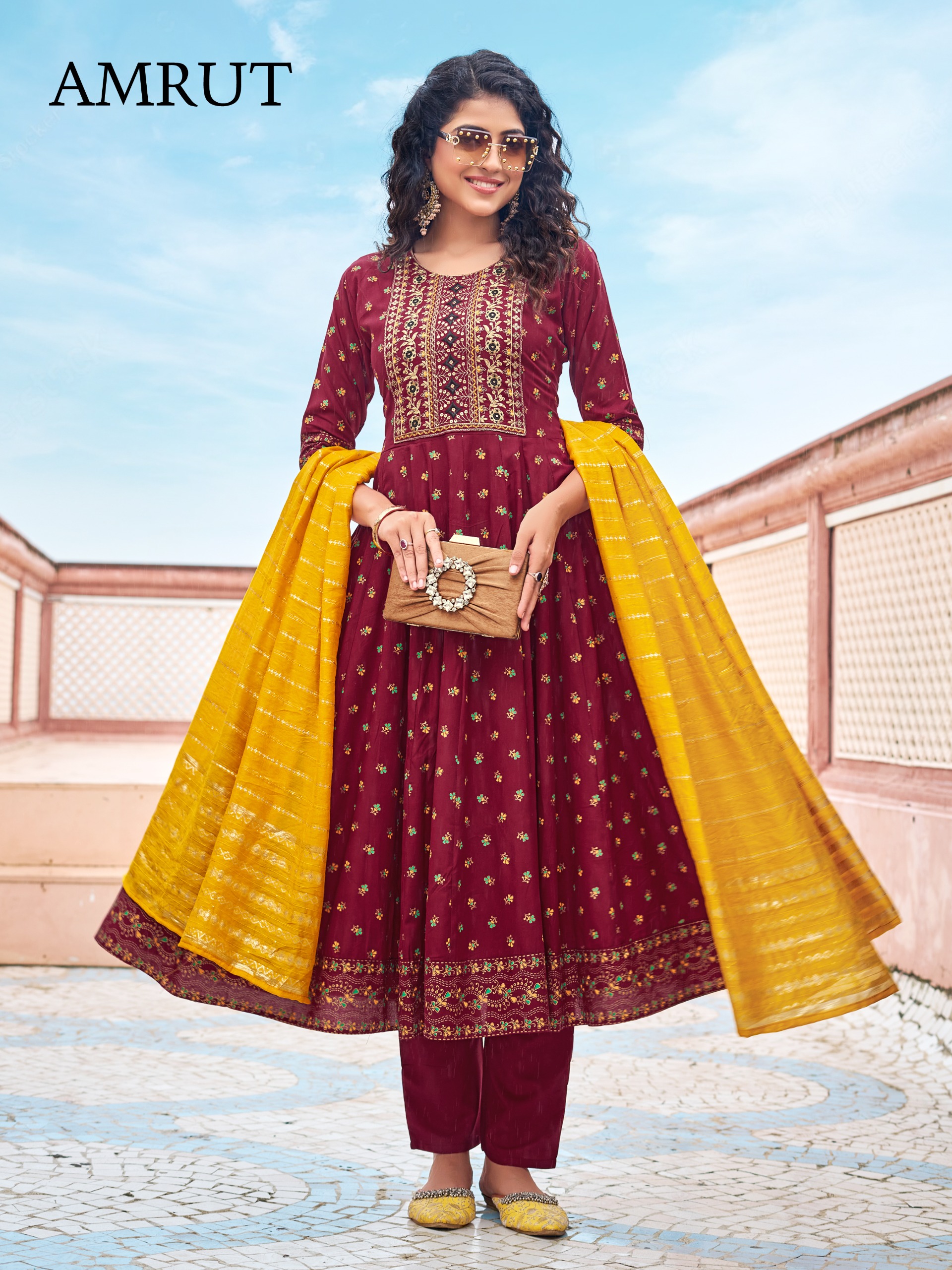 GOWN :- 14KG RAYON WITH HEAVY SEQUENCE EMBROIDERY WORK WITH COLOR FOIL PRINT