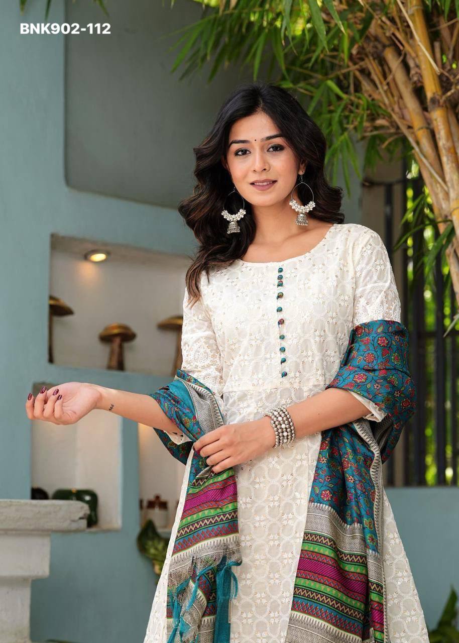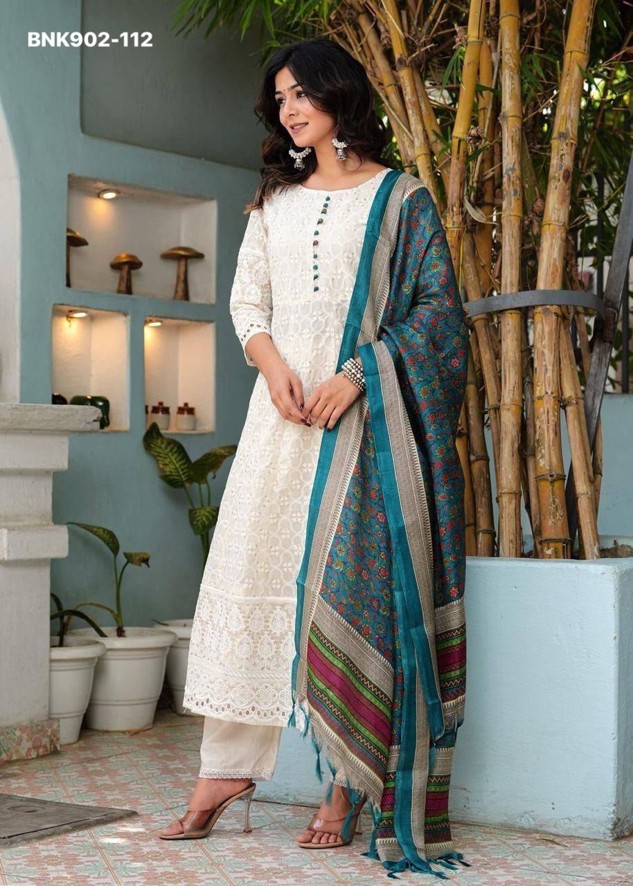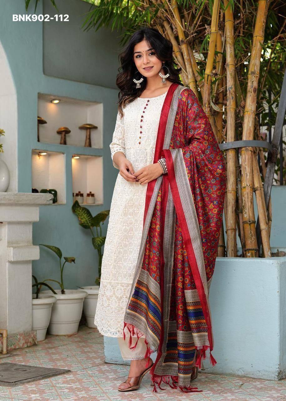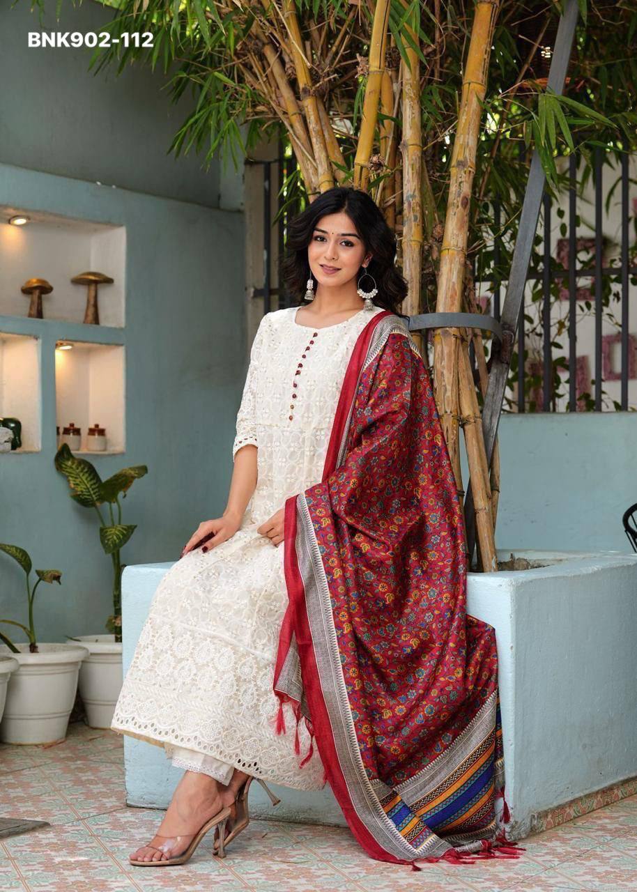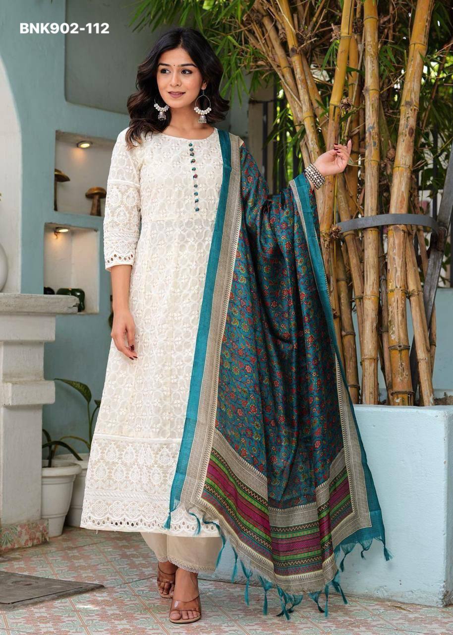 *Pure Chikankari Anarkali kurti with pant and silk chanderi digital Print dupatta set*