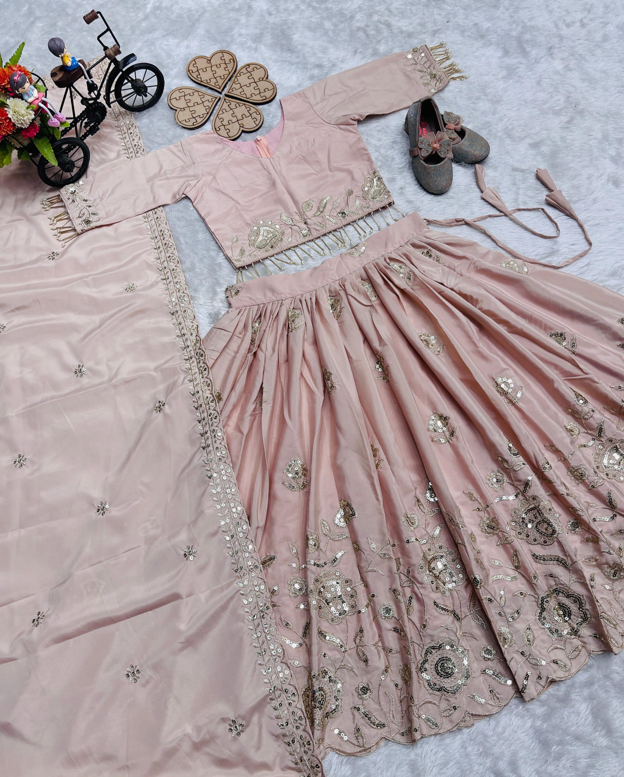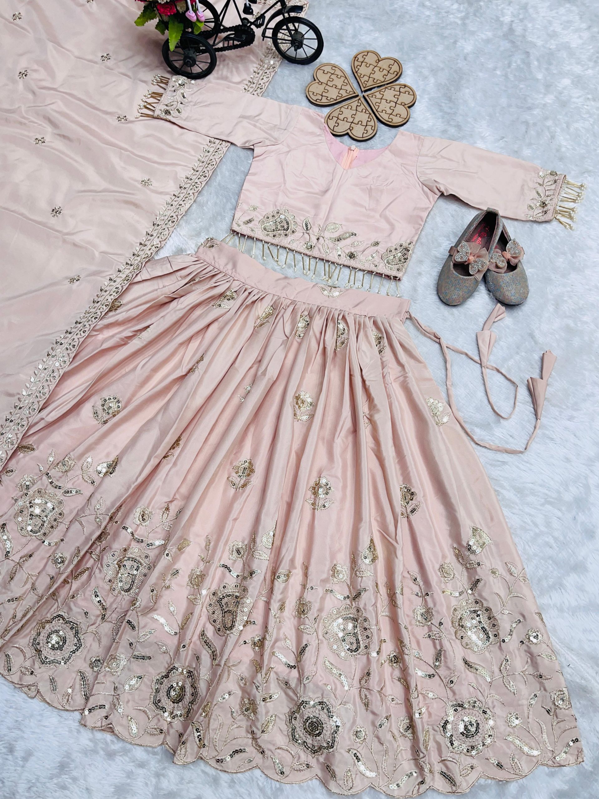 Pure Heavy Natural Crep Silk With Embroidery Sequence Work Kids Lehenga Choli